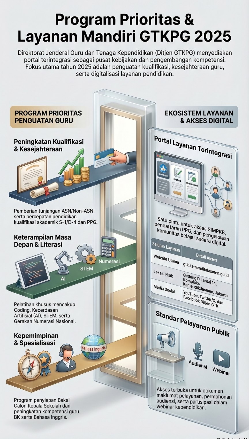 CILEGON – Menindaklanjuti kebijakan terbaru Kementerian Pendidikan Dasar dan Menengah (Kemendikdasmen), Direktorat Jenderal Guru dan Tenaga Kependidikan (Ditjen GTK) resmi menggulirkan rangkaian program prioritas tahun 2025. Program ini membawa angin segar bagi dunia pendidikan karena seluruh layanan pengembangan kompetensi, karir, dan kesejahteraan kini terintegrasi dalam satu pintu layanan digital.